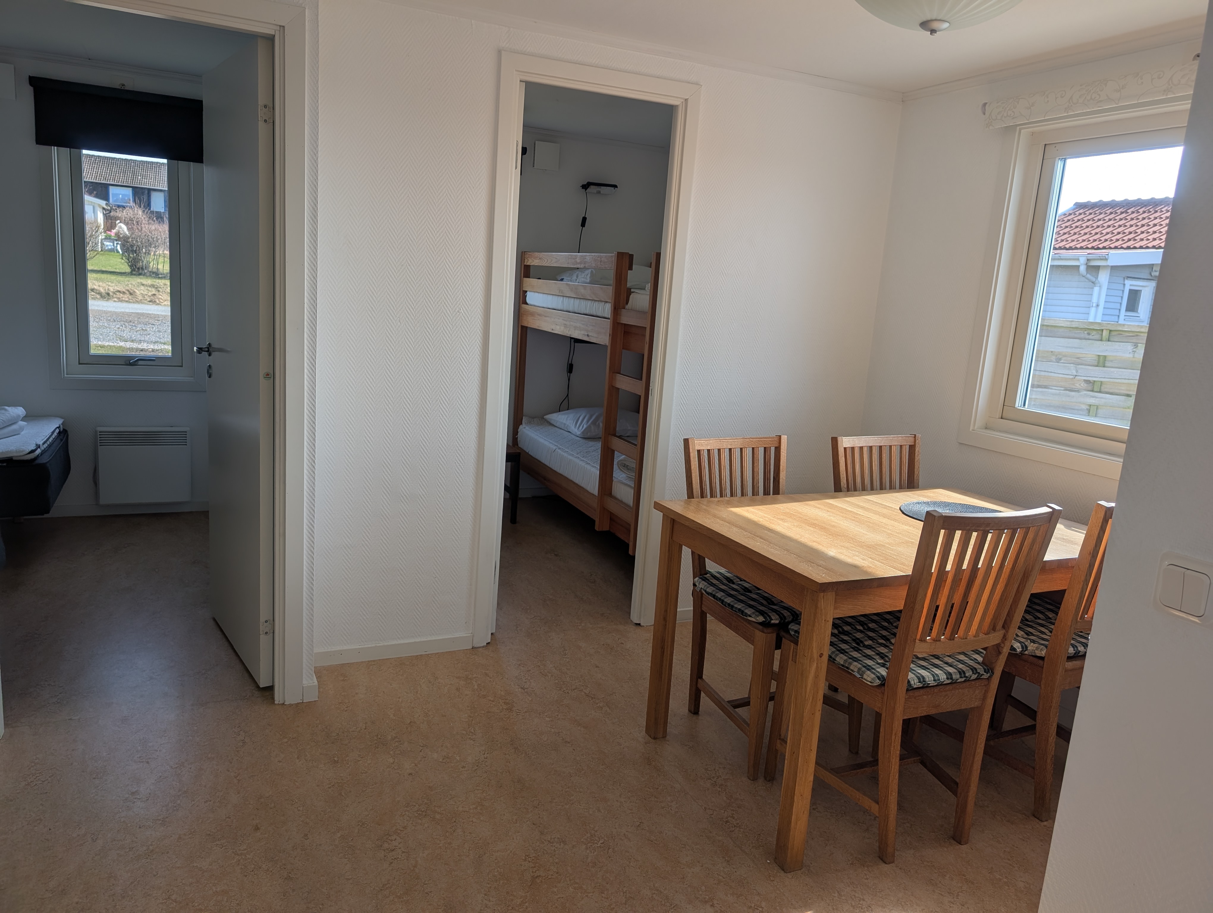 6st bäddar fördelade på ett sovrum med två enkelsängar och ett sovrum med en våningsäng samt bäddsoffa i allrummet.